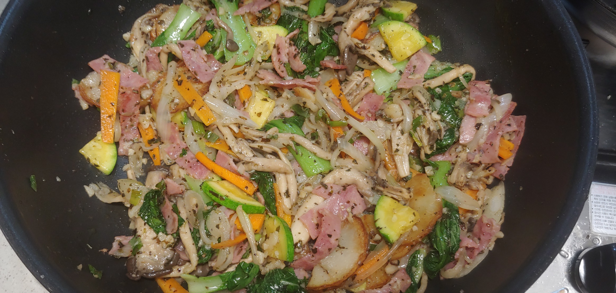 4. 남은 양파와 야채/채소들을 모두 넣고 소금과 후추를 한꼬집 뿌려주고, 건바질을 제 취향만큼 뿌려서 계속해서 강불로 볶아줍니다. 수분이 생길수 있는데, 수분을 계속 볶아 날려버릴수록 프리타타의 완성도는 높아집니다. 다 볶으셨으면 불을 꺼줍니다.